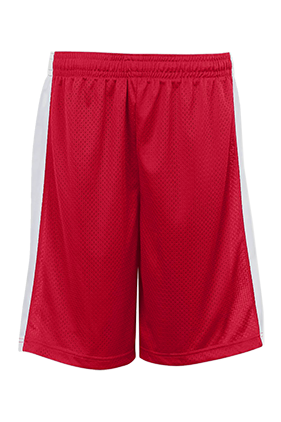100% polyester mesh with 100% polyester dazzle side panels.  9" Inseam.  Athletic cut.  Superior Fit.  Covered elastic  waistband and drawcord.  Badger heat transfer logo on left hip.