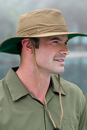 Safari crown hat with wide floatable brim and mesh ventilation insert in top of crown. Green under visor for glare reduction. Adjustable chin strap and an interior Velcro closure pocket.