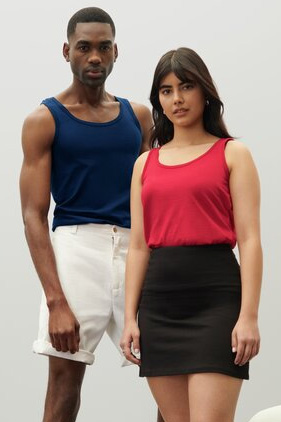 Self-fabric trim applied to neckline and armholes. Seamless body. Semi-fitted. Classic fit. Smooth printing surface. Black tear-away label; transitioning to recycled material.