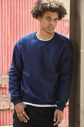 Heavyweight. Two-needle coverstitching on collar, armholes and waistband. 1x1 rib cuffs, collar and waistband with spandex for stretch and recovery. Quarter-turned to eliminate center crease. Seamless body. High stitch density for a smooth printing canvas. Tear away label.