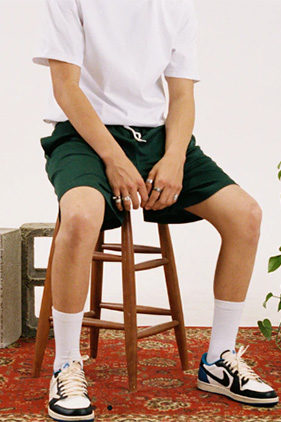 Elastic waistband with drawstring. Side-seamed. Double stitched. Back right side pocket. Side pockets. Above the knee. Sewn in label.