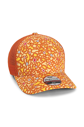100% recycled polyester, performance, sublimation print fabric. Mesh sides and back. Moisture-wicking sweatband.