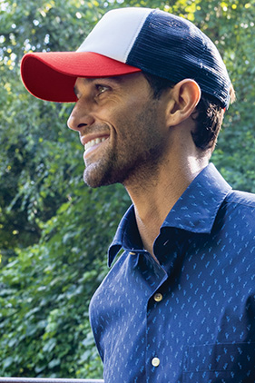55/45 algodón/poliéster. Parte trasera de malla. Panel frontal de sarga lavada con refuerzo de espuma.